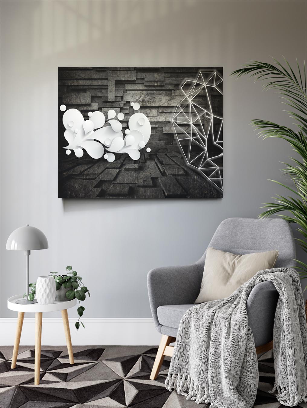 Impression sur toile polystretch, installation sur cadre toile tendue et fixation murale par vis.
