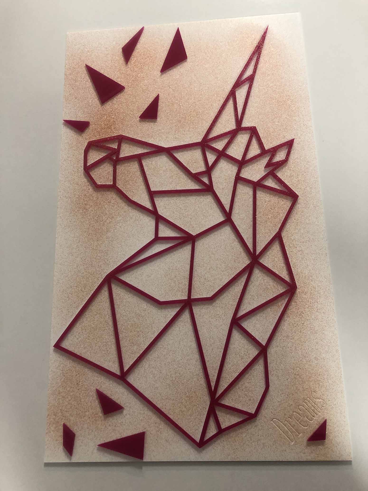 Découpe laser PMMA rose à la forme collé sur panneau plexus blanc glose et pailleté à la bombe. Fixation crochet arrière.