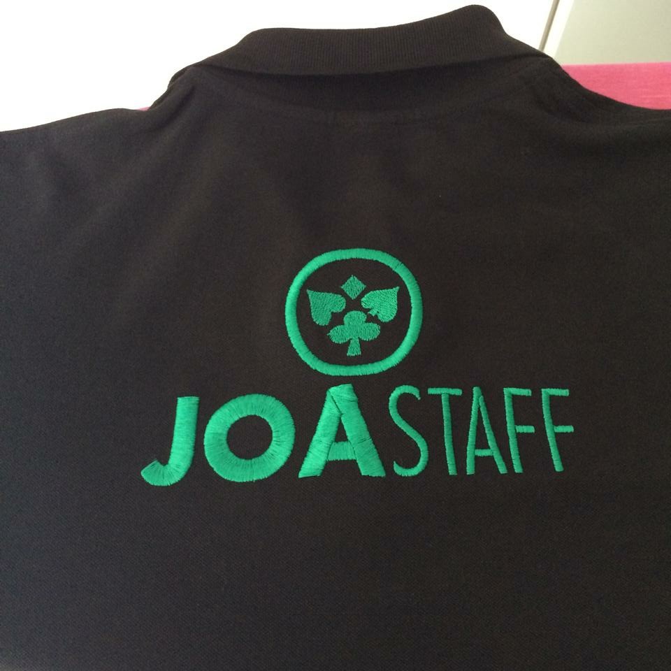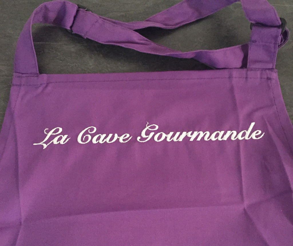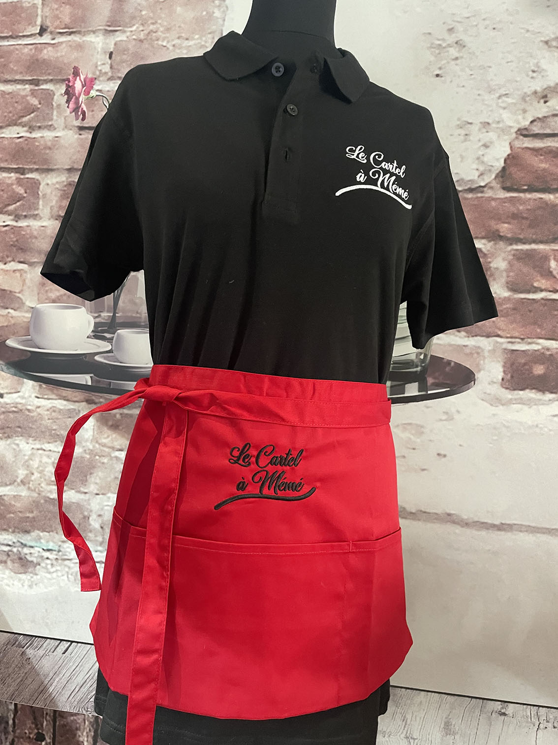 Broderie haute qualité sur un polo noir et un tablier professionnel.
