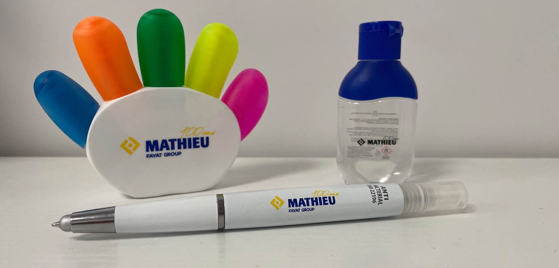 Feutres fluo, gel hydroalcoolique et stylo logotés pour MATHIEU, Fayat Groupe