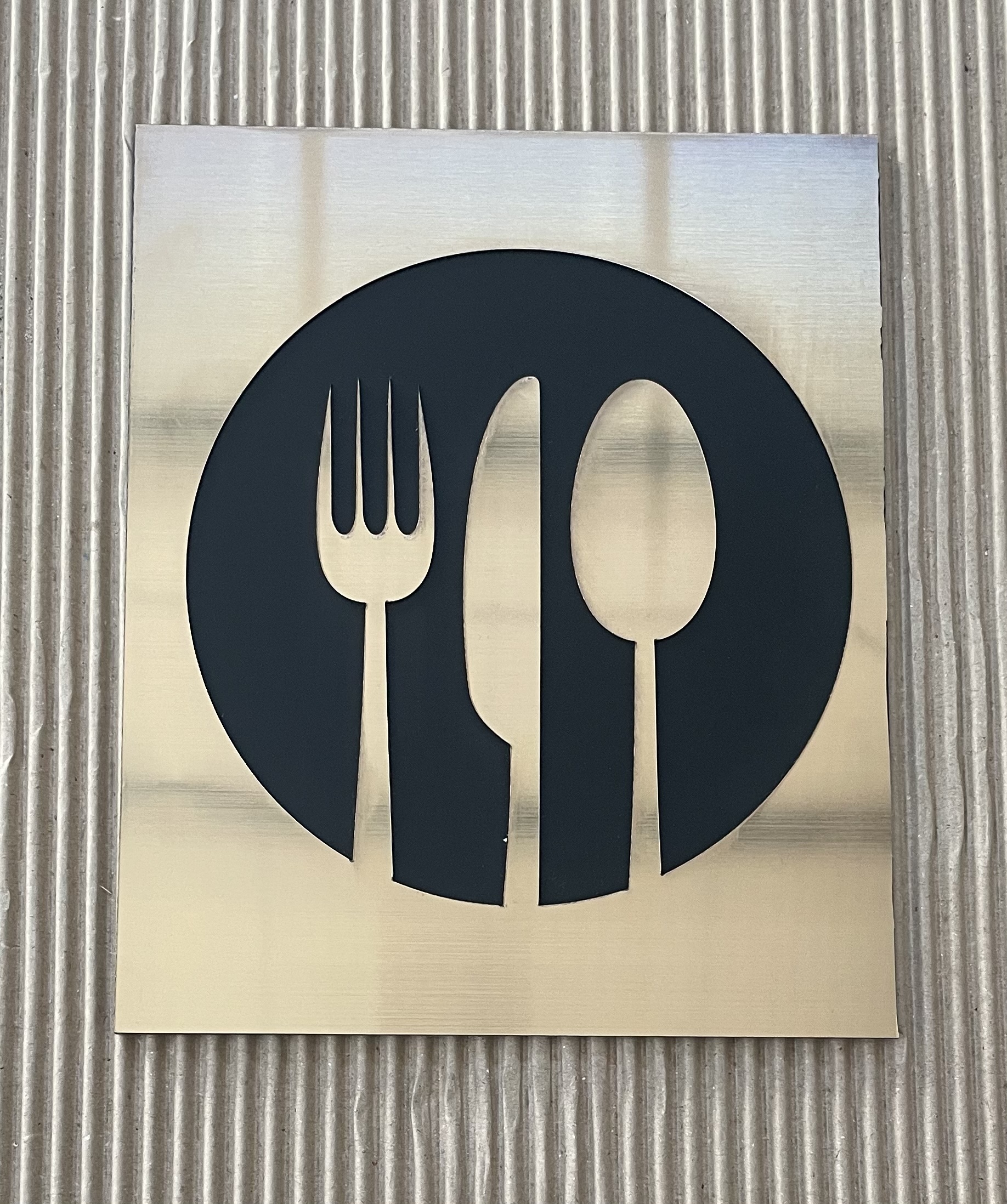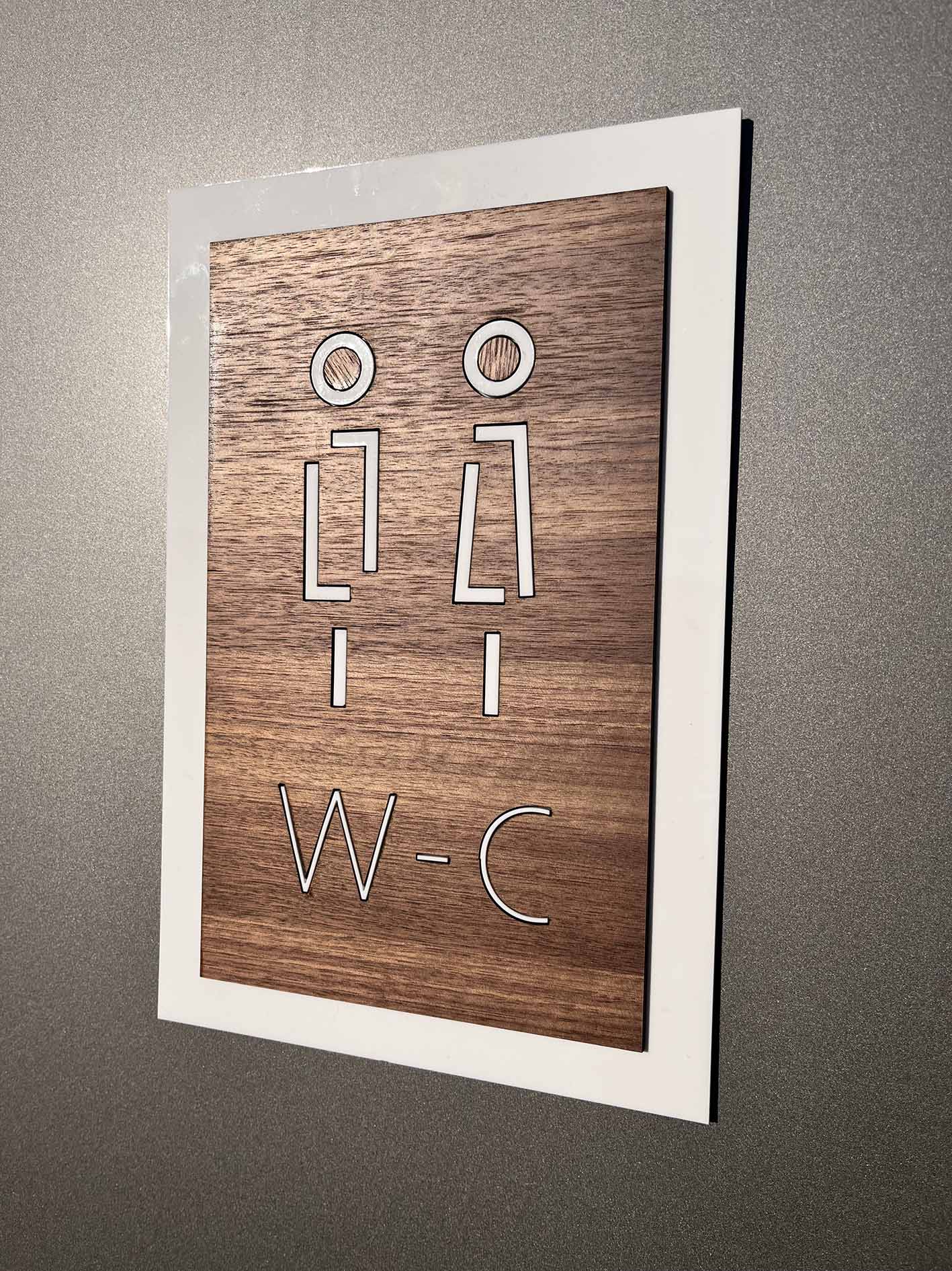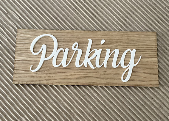 Usinage bois hêtre en 10 mm. Découpe laser de PMMA Ivoire pour signalétique directionnelle intérieure.
