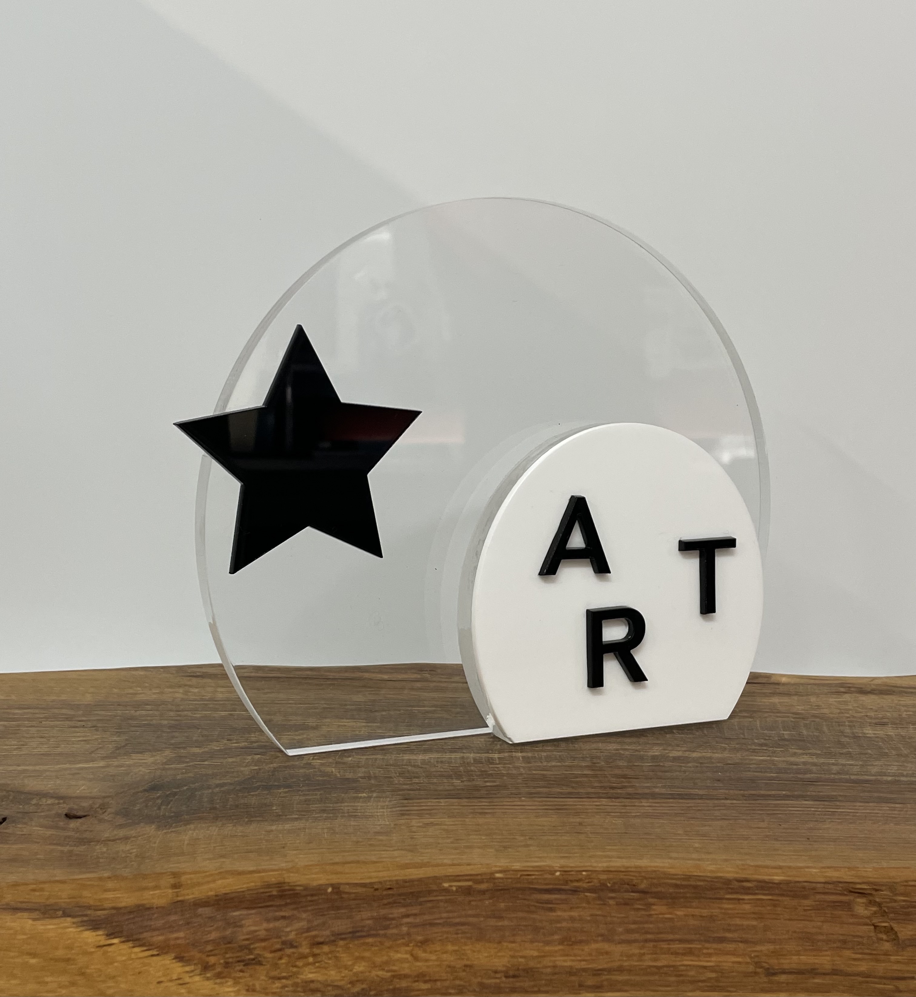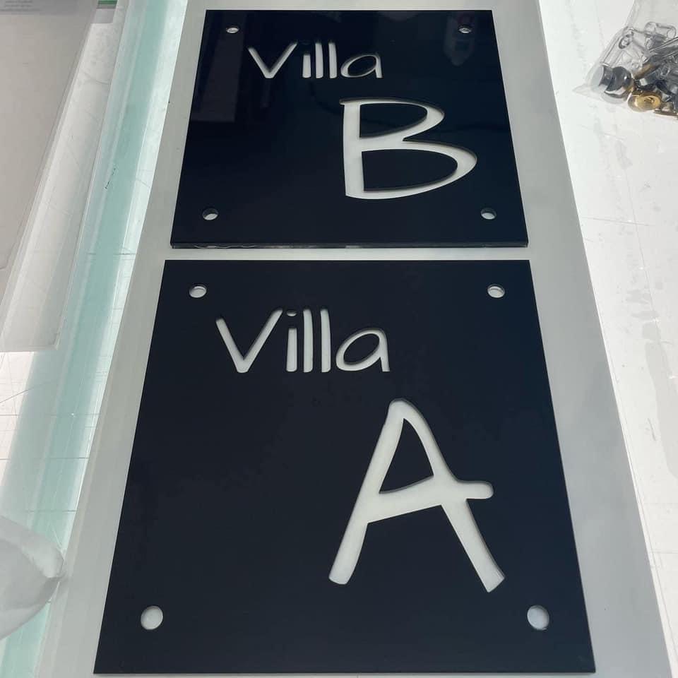 Enseigne lettres découpées en PMMA mélange glossy et mat installées sur entretoises et posées sur plaque alu adhésivée.