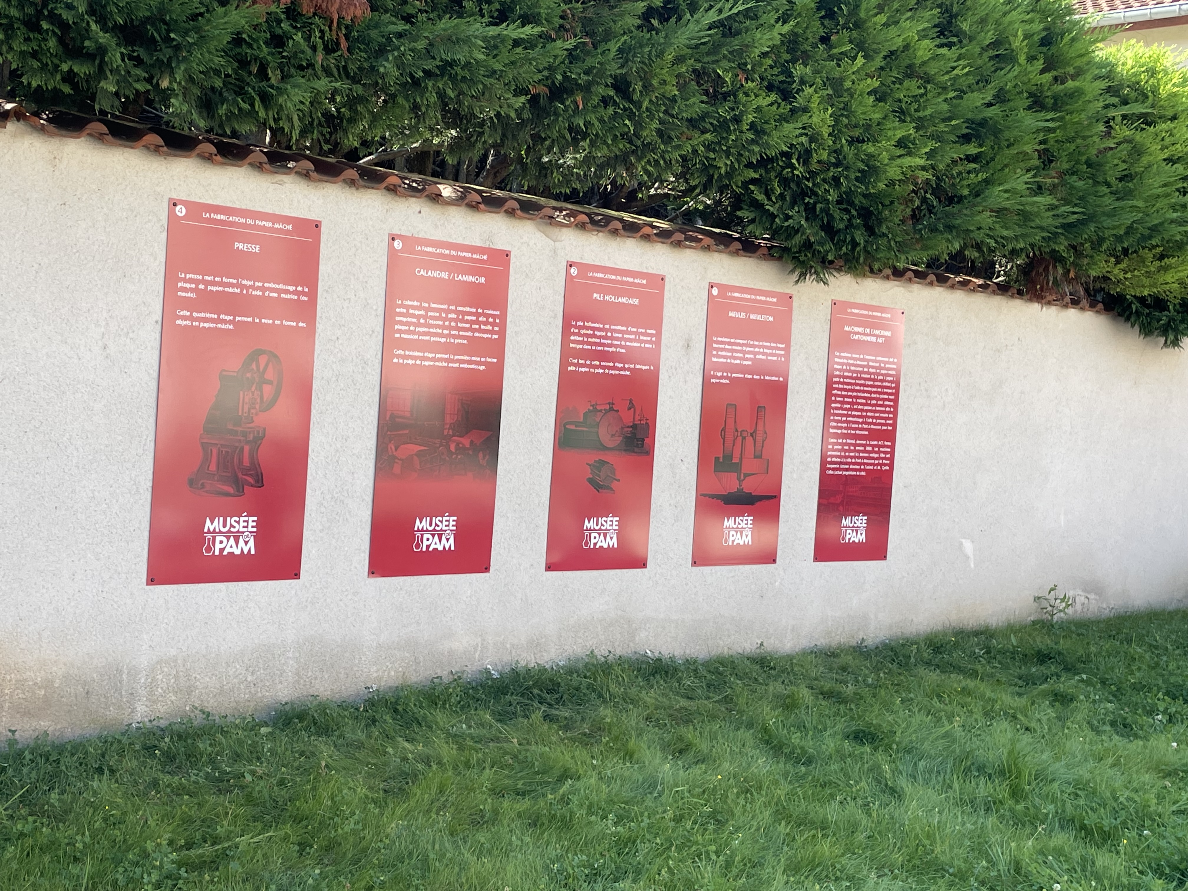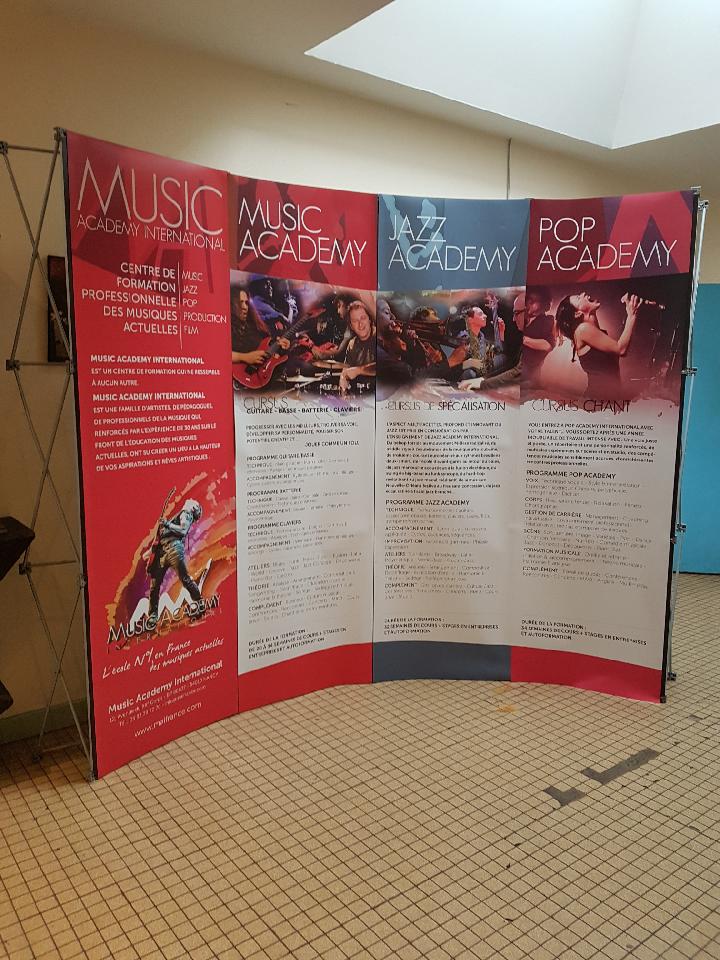 Création visuels, mise en page, impression d’un mur d’image en PVC semi rigide, fixation par bandes magnétiques sur structure alu pliable avec sac de transport.