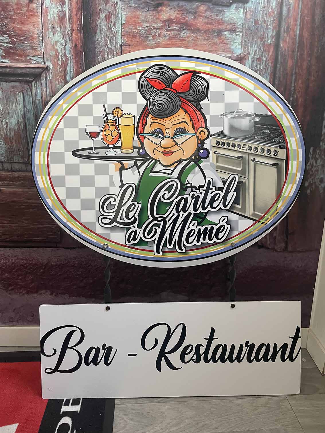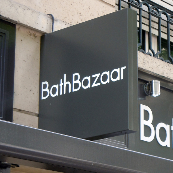 Enseigne drapeau sur tôle thermolaquée lettres découpées en PMMA éclairage LED.
