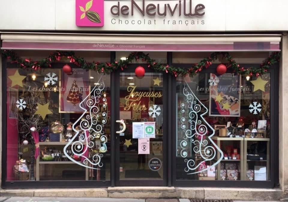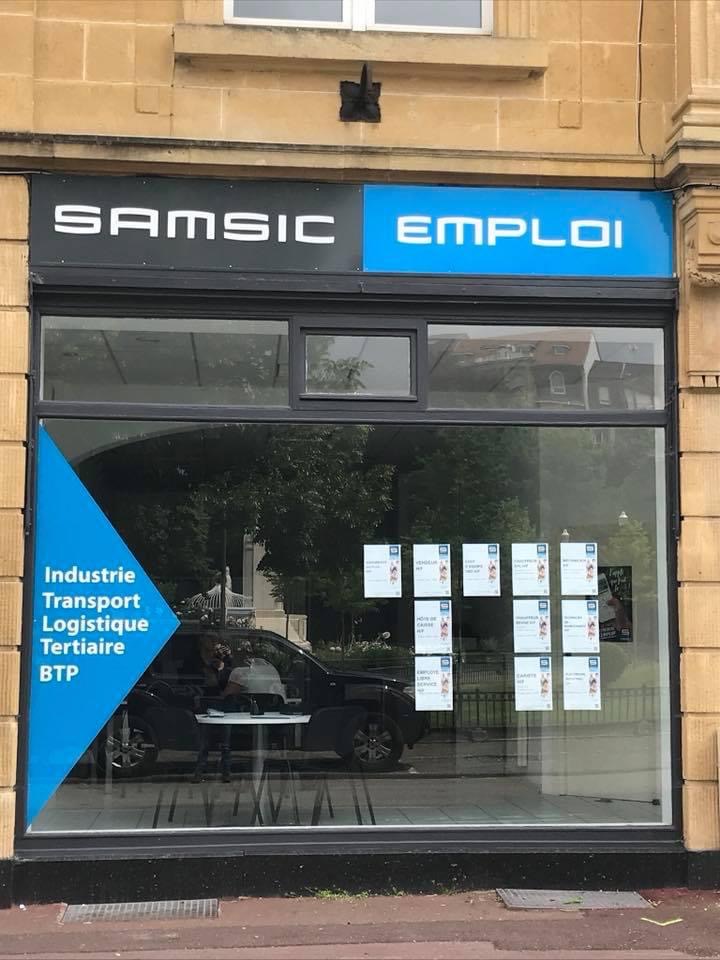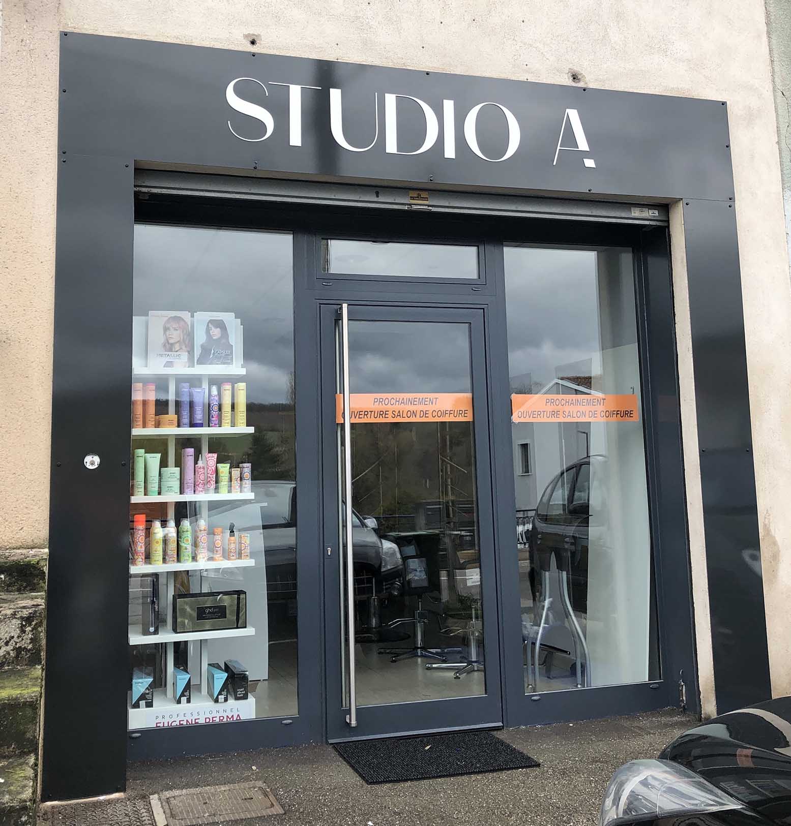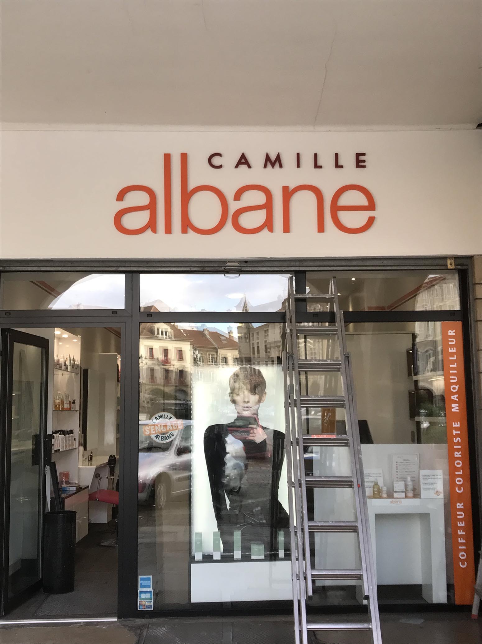 Découpe lettres polystyrène teintées selon charte client Installation sur plaque de verre peinte. Adhésif sur vitrine.